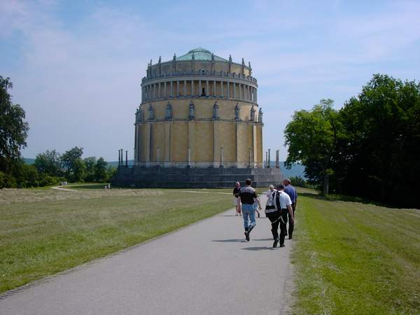 Nachdem Helwig seine Kette geschmiert und die BMW-Fahrer ihren Ölstand wieder auf Maximum gebracht hatten, konnte die Heimreise angetreten werden. Damit die Fahrt nicht in eine langweilige Autobahnfahrt ausartete, wurde als nächstes Ziel die Befreiungshalle bei Regensburg angesteuert und etwas deutsche Geschichte aufgearbeitet. Reinhold´s Navi, auf den er nicht mehr verzichten kann, machte heute wieder einen ganz besonderen Spaß mit uns. So führte er uns zielstrebig mit einer kleinen Fähre über die Donau, um uns 2 km weiter wieder über eine Brücke zurück auf die ursprüngliche Seite zurückzuführen. Naja so haben wir auch mal eine Schiffstour über die Donau gemacht und den Fährmann hat´s auch gefreut. Auf dem Parkplatz vor der Befreiungshalle stellten wir unsere Motorräder ab und gingen die letzten Meter zu Fuß, was bei der sengenden Hitze eine schweißtreibende Angelegenheit war. Der anstrengende Fußmarsch wurde aber durch einen herrlichen Rundblick belohnt. Auf der Landstraße fuhren wir bis kurz vor Nürnberg und da plötzlich ein Gewitter aufzog, fuhren wir von hier aus über die Autobahn in unsere Heimat.